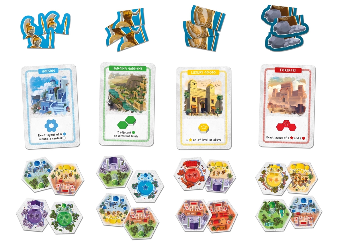 Najważniejszą nowością są karty Konstrukcji, które wyznaczają dodatkowe cele do zrealizowania podczas budowy miasta. Każda z czterech losowo wybranych kart wymaga spełnienia określonych warunków układu dzielnic, a ich realizacja nagradzana jest fragmentem posągu Ateny oraz specjalnym mini-kaflem. Te pojedyncze płytki pozwalają na elastyczniejsze łączenie dzielnic i zdobywanie dodatkowych punktów.