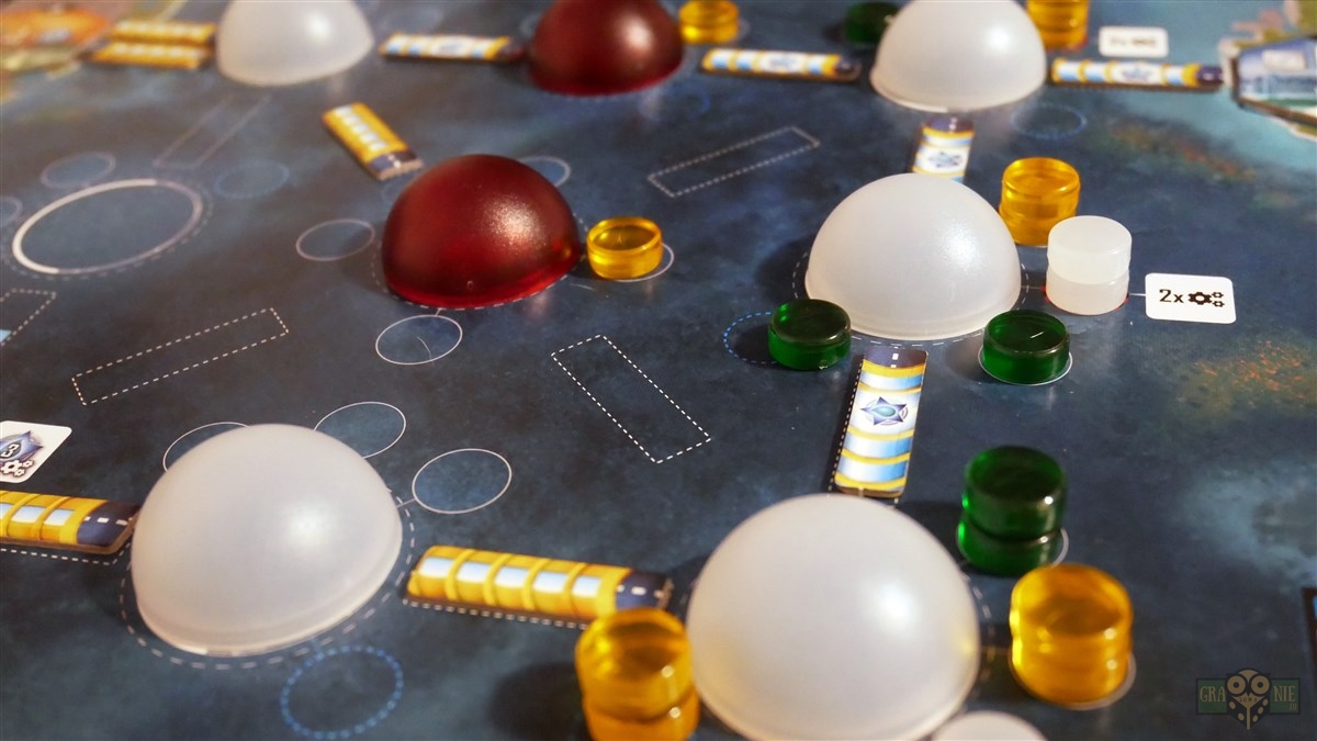 Na planszy gracza możemy również budować tunele, które będą pozwalały tworzyć sieć budynków. Jest to bardzo ważny element gry, bo budynki i miasta nie połączone tunelami ze startową kopułką nie będą nam niczego produkowały. Z drugiej strony nie połączone miasto nie będzie od nas wymagać wyżywienia mieszkańców algami.